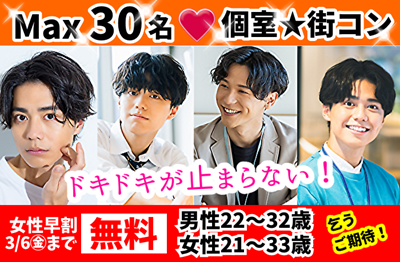 <女性3/19㊍12時までのご予約で無料!>【MAX30名☆20代30代】 高身長・大卒・年収600万~etc... 《大人数☆メガ個室Party》男性26~38歳×女性25~39歳
